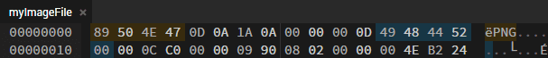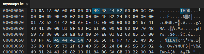 Opening the file in a hex editor, we observe what appear to be PNG chunk headers. Notably, the IHDR and IDAT headers (which are required in a PNG file) are immediately visible.