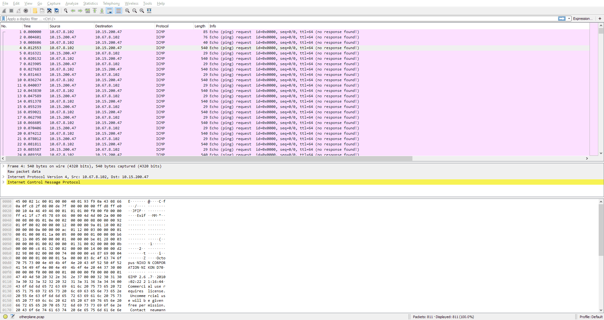 This is yet another pcap. We see a long stream of ICMP ping packets, but suspiciously, they contain lots of data. Starting at packet 4, all the packets contain 540 bytes of data, and curiously, there is what appears to be a JPEG header in it.