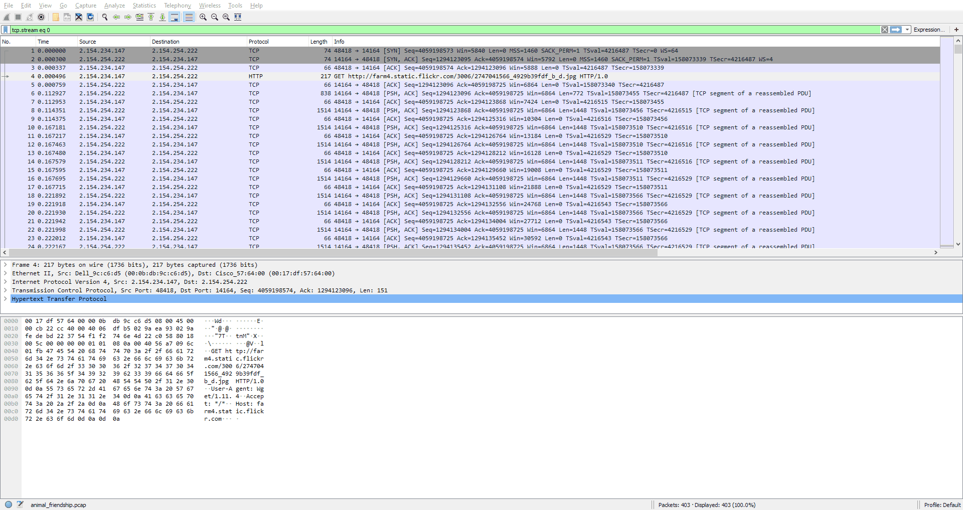 We can see that there is a request for a jpg file that completes near the end of the capture. We can export this object with File > Export Objects > HTTP....