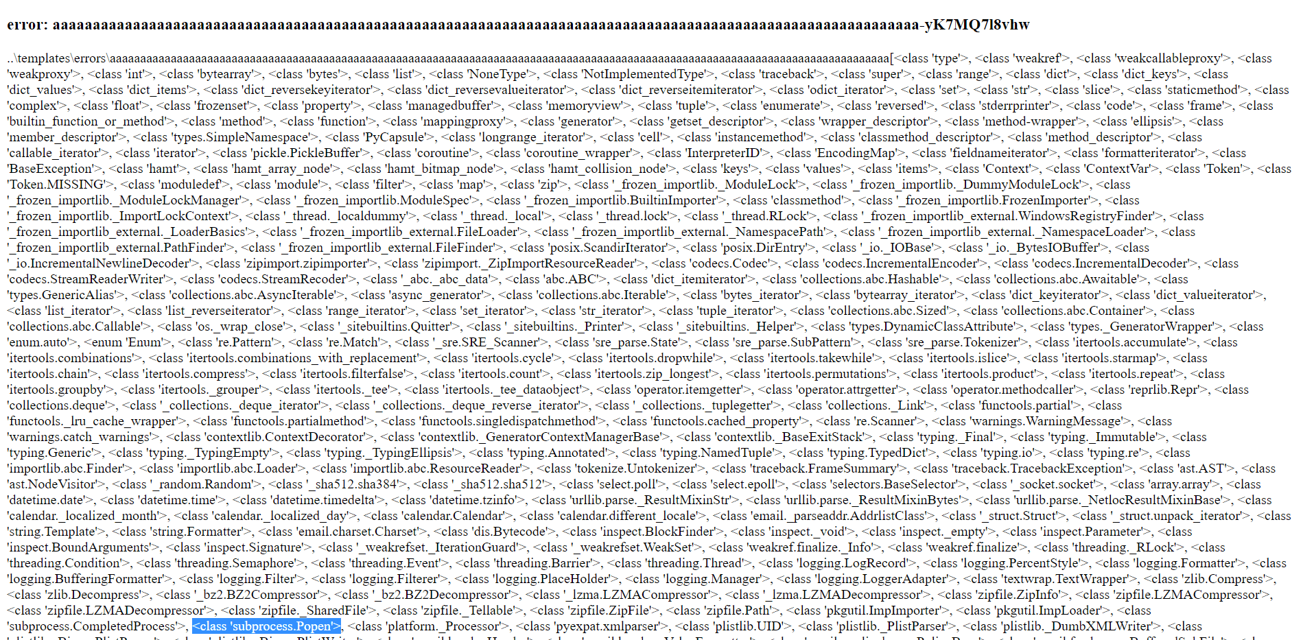 p = "..\\templates\\errors\\" + "a" * 128 + "{{ ''[request.args.get('class')].mro()[1][request.args.get('subclasses')]() }}"When we access the index page with the filename passed into error, we get an internal server error. This is because we didn’t pass in the class or subclasses query parameters. After setting them to __class__ and __subclasses__, respectively, a whole bunch of stuff is rendered.